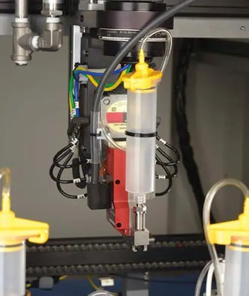Konformal kaplama ve kimyasal uygulamayı beş eksene kadar hassasiyetle yapar. Otomatik olarak aplikatör ucu değiştirmesiyle rakip sistemlerden ayrışır. Bu özellik sayesinde uygulama alanından kayıp vermeden en esnek çözümleri sunar. RTV, yapışkan, silikon, akrilik, üretan, epoksi, termal pasta, çift komponent vb malzemeyle kullanıma uygundur. ...devamını oku